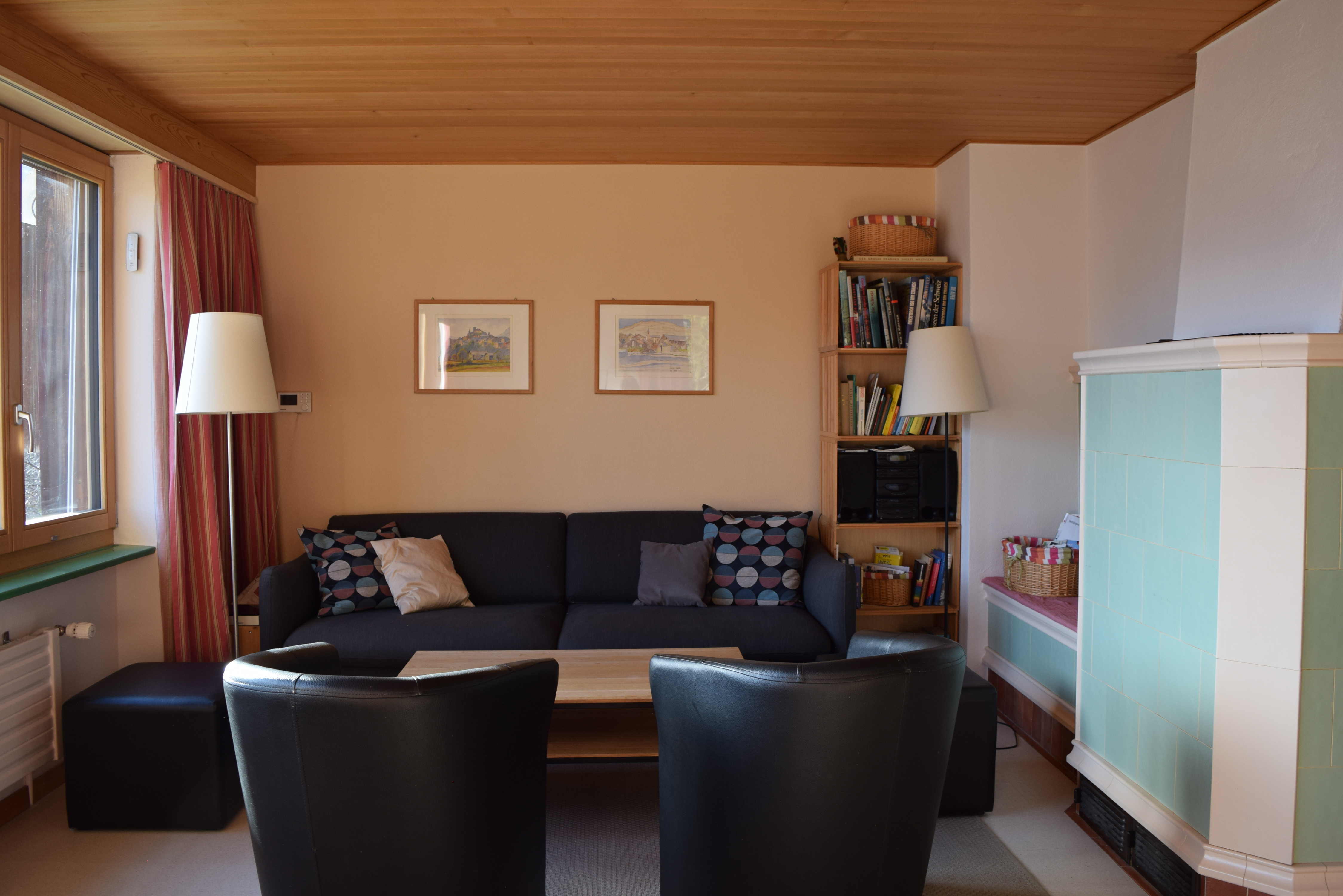 Im Gestell neben dem hellgrünen Kachelofen finden sich viele Bücher und Bildbände zur Region. Auch einige Wanderkarten und Wanderführer sind vorhanden.
