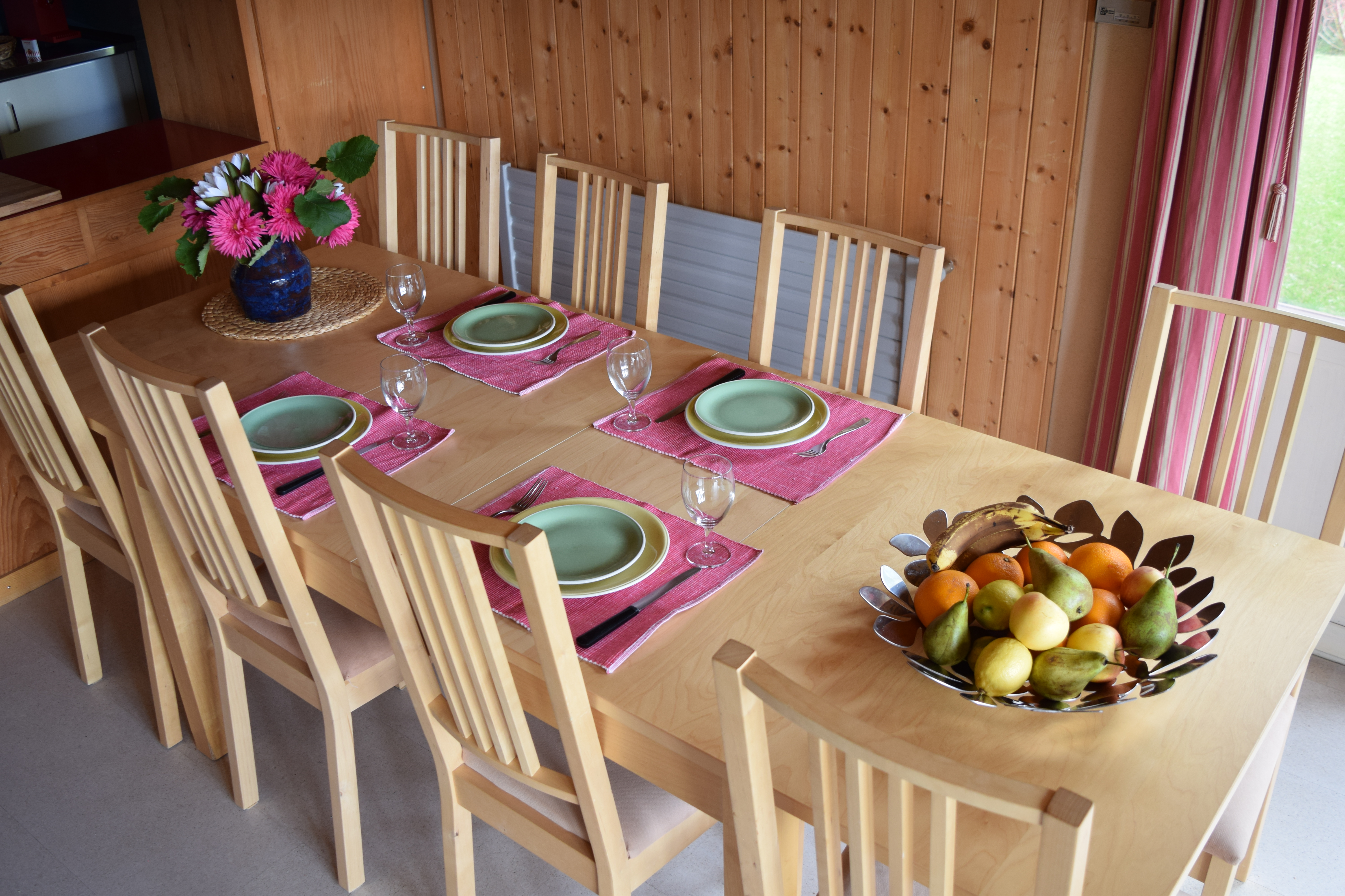 Der verlängerbare Esstisch bietet Platz für 4 - 10 Personen. Der kleine Tisch am Fenster kann als weitere Verlängerung genutzt werden.