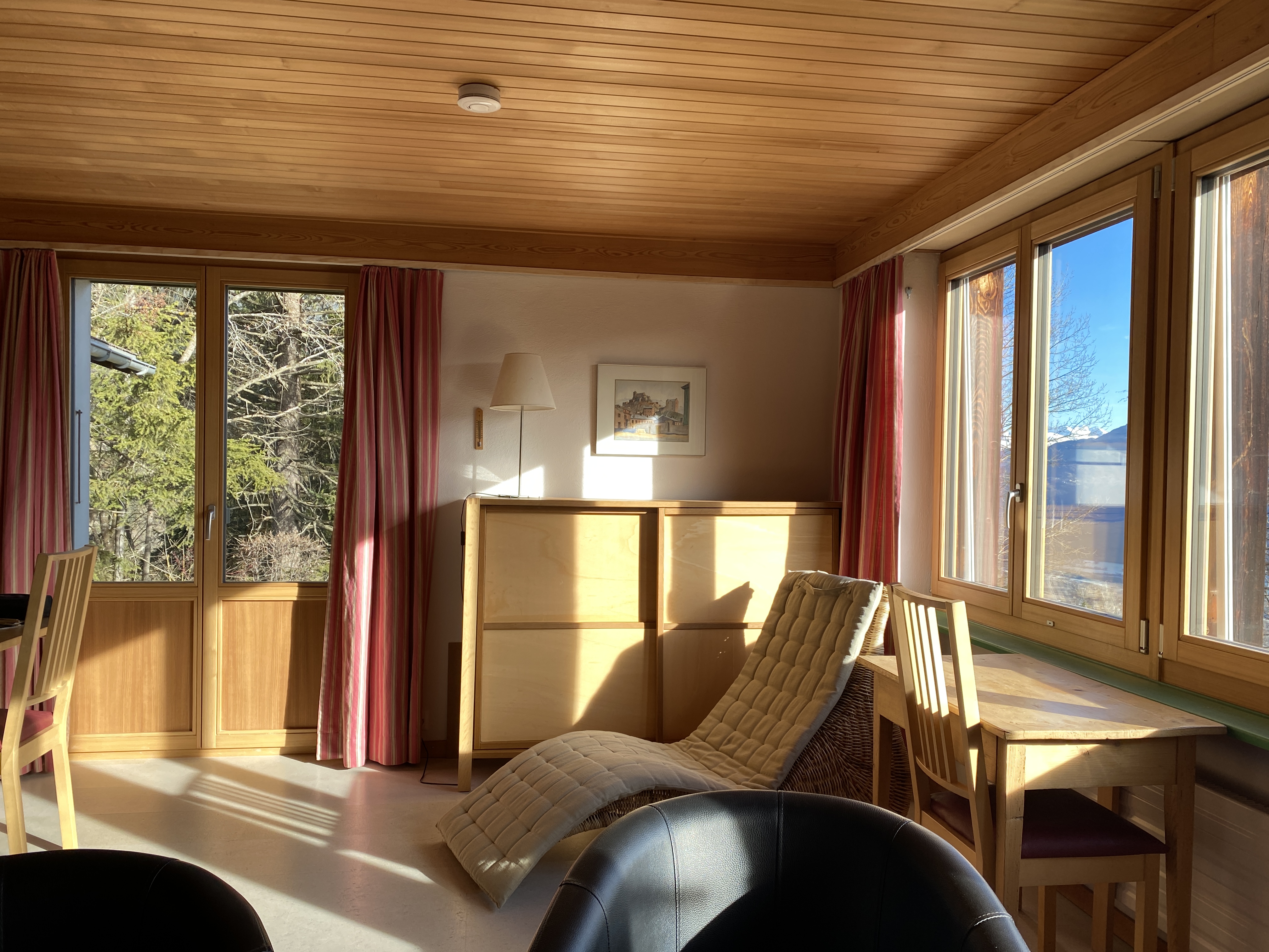 Das Wohn-Ess-Zimmer ist rund 27 m2 gross. Es ist liebevoll und zweckmässig möbliert und enthält eine kleine Stereoanlage mit Radio, Kassettengerät und CD-Player (das TV-Gerät wurde nicht hier, sondern im Balkonzimmer installiert).